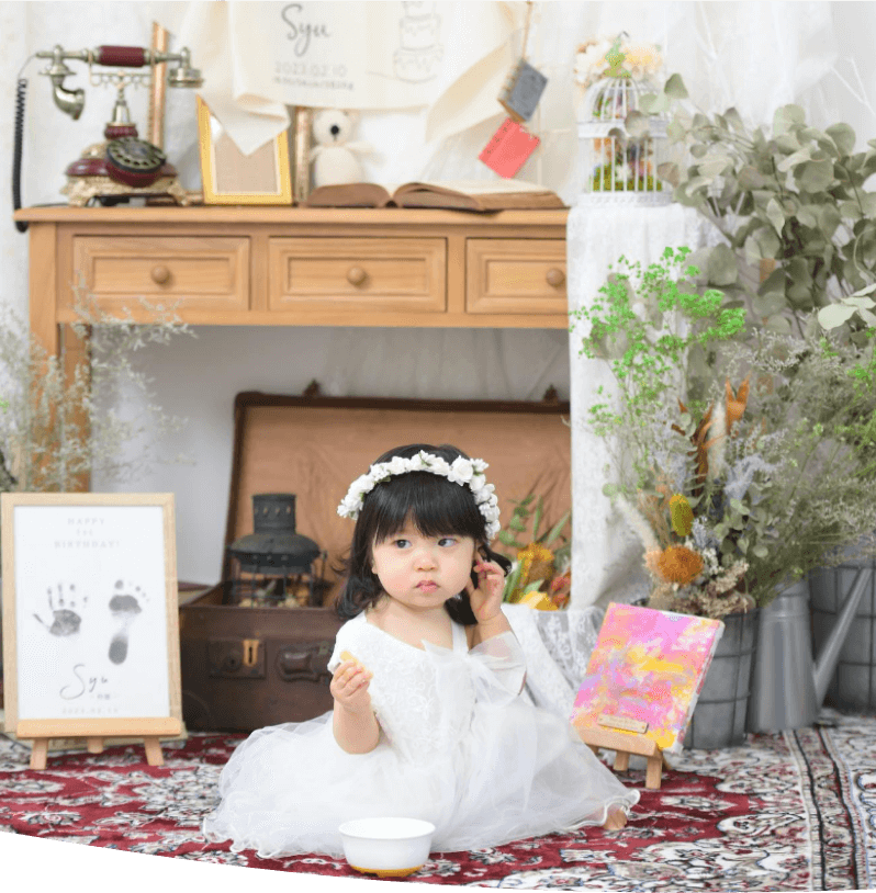 お子さまの撮影や小物アレンジも得意で、「こんな雰囲気にしたい!」というご要望にも柔軟に対応します。